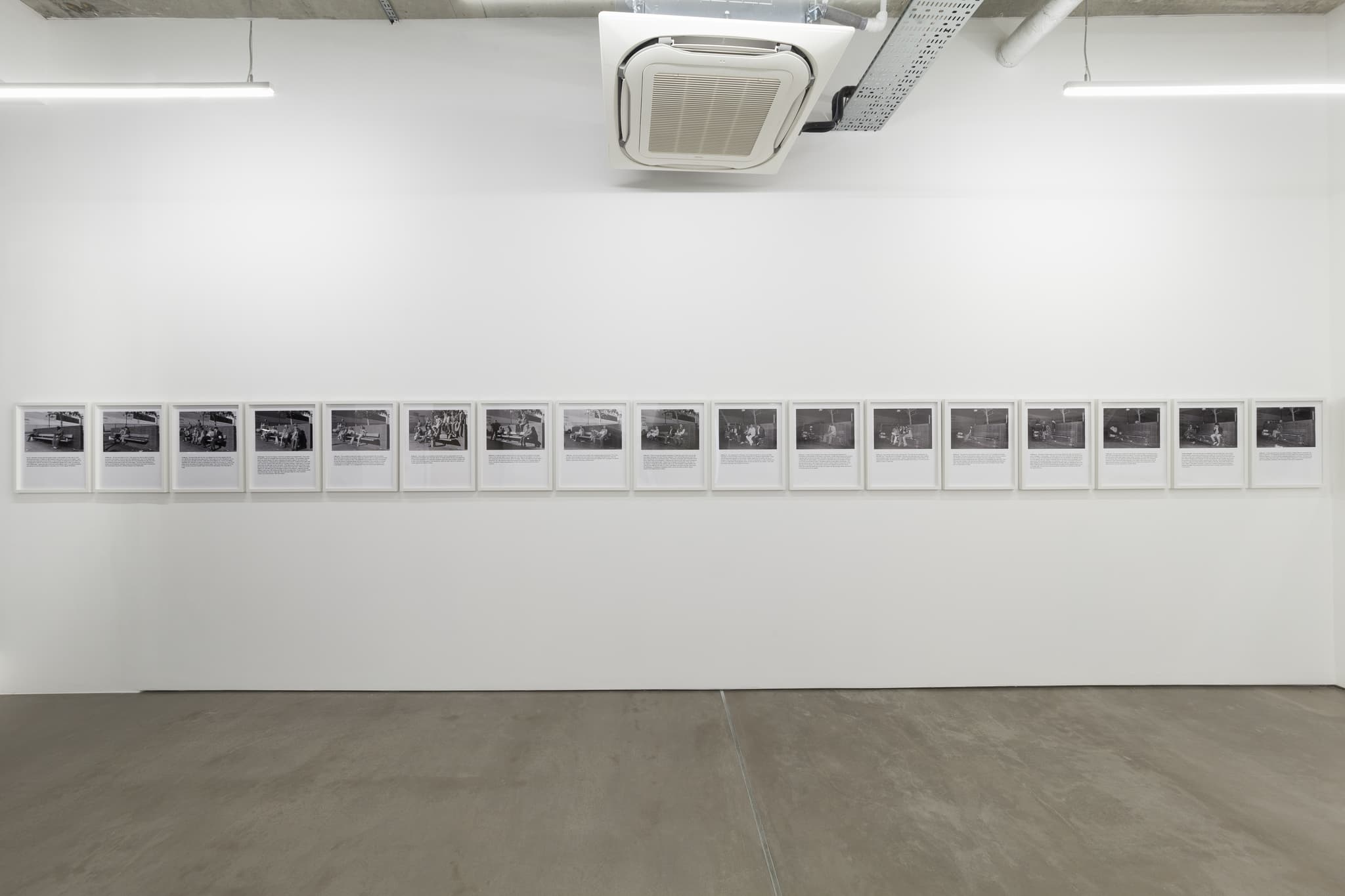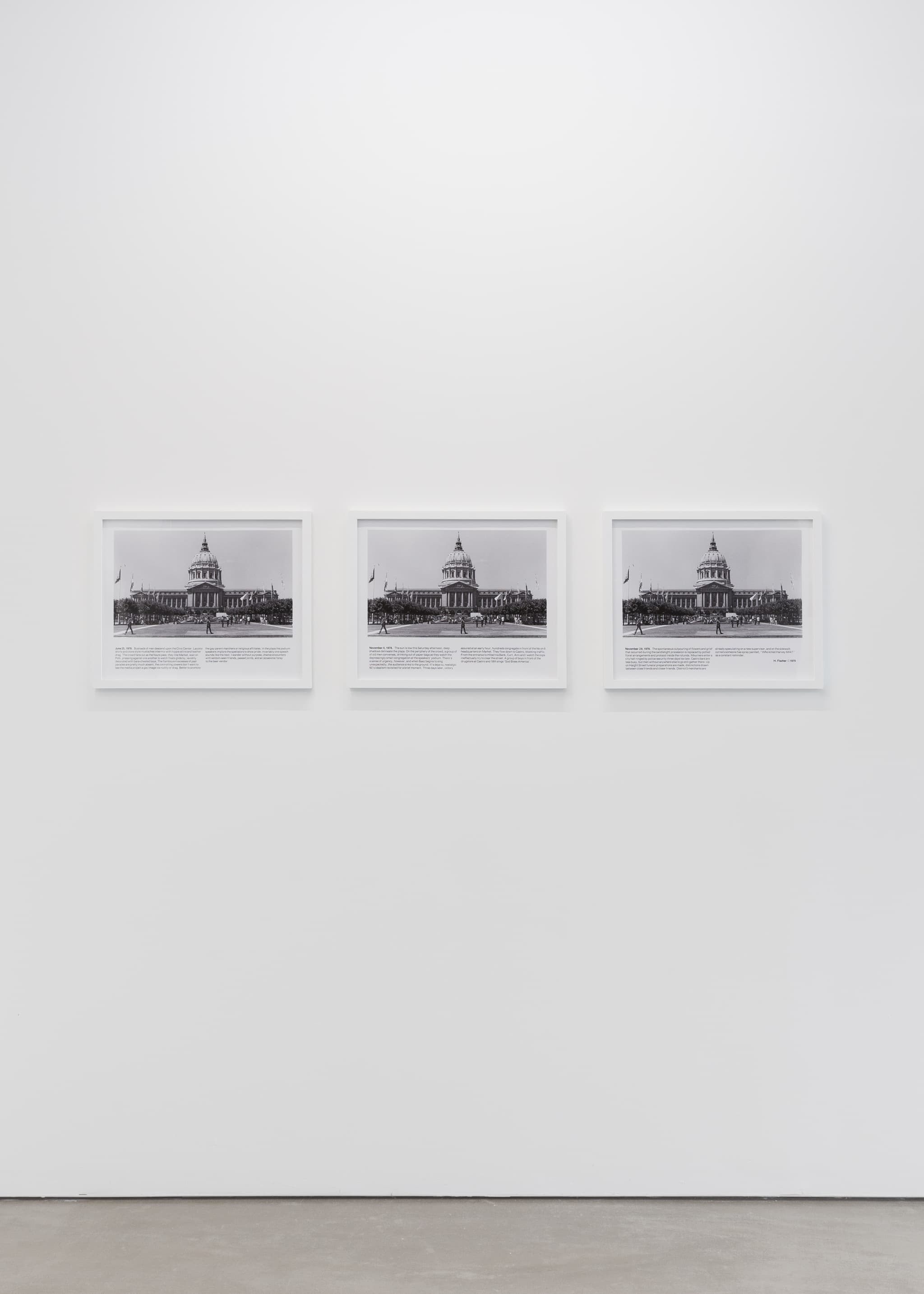 Hal Fischer’s second solo exhibition at the gallery presents three series of works shown for the first time in the UK: 18th near Castro St. x 24, 1978, is a hybrid of performance, photography and portraiture. For 24 hours, Fischer took a photograph of a bus stop bench at the corner of 18th and Castro Street in the heart of San Francisco’s gay village. Along the way, the artist cruises, catches up with friends, increasingly getting drunk and high. Civic Center, 1979, is a triptych focusing on San Francisco’s City Hall at three key moments: the annual gay pride celebration, a protest against Proposition 6, an initiative to ban gays from working in Californian schools, and the assassination of Harvey Milk, the first openly gay elected official in the history of California. Cheap Chic Homo, 1979, is a performative deconstruction of a friend’s everyday outfit. Listing both the items of clothing as well as their provenance, Fischer’s subject cheekily looks to the audience in an often sly manner.