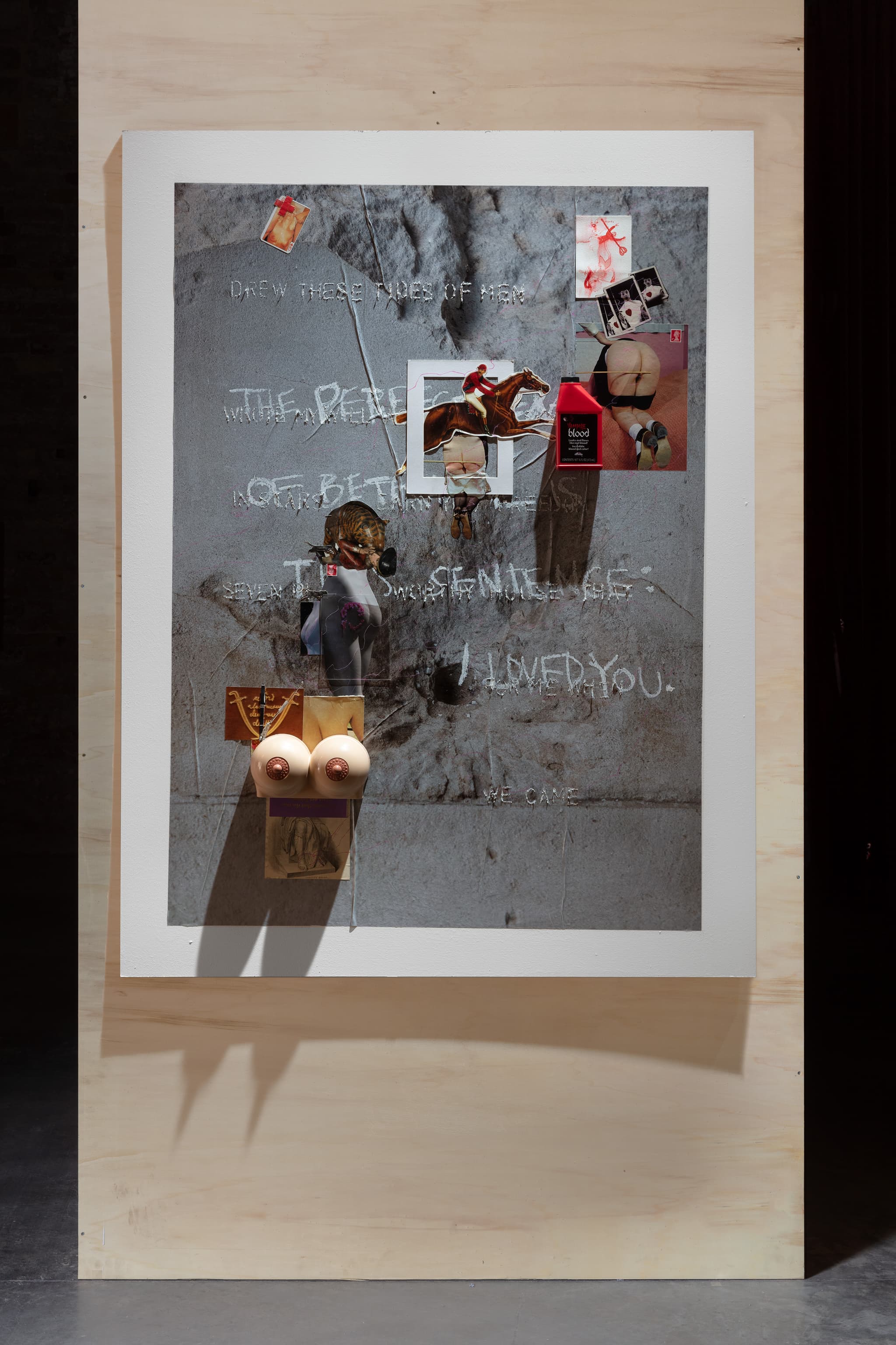 Acrylic, pastel, oil stick, radio, prop vampire blood bottle, c-type print, drawing and found material on latex print on board, framed