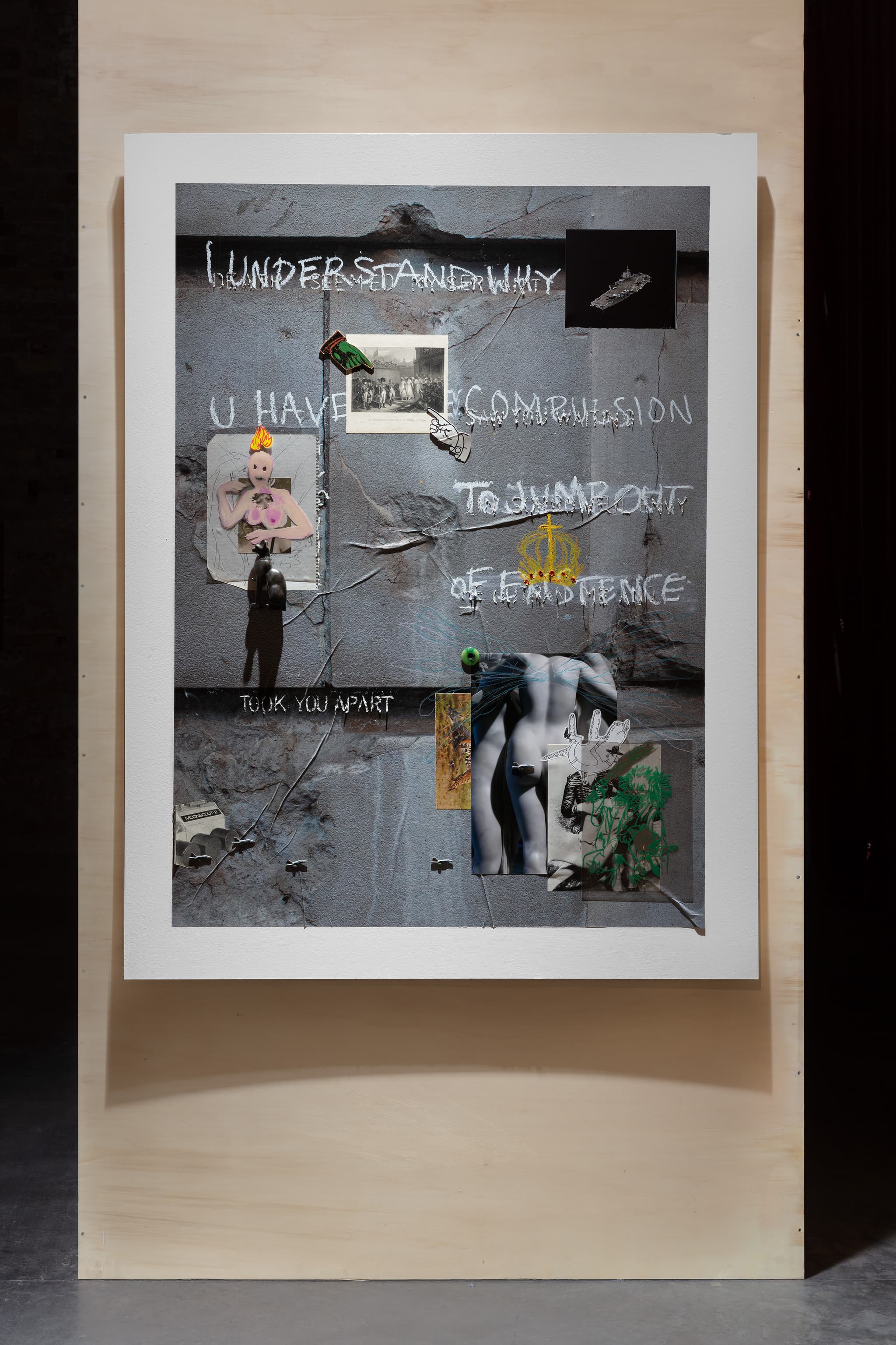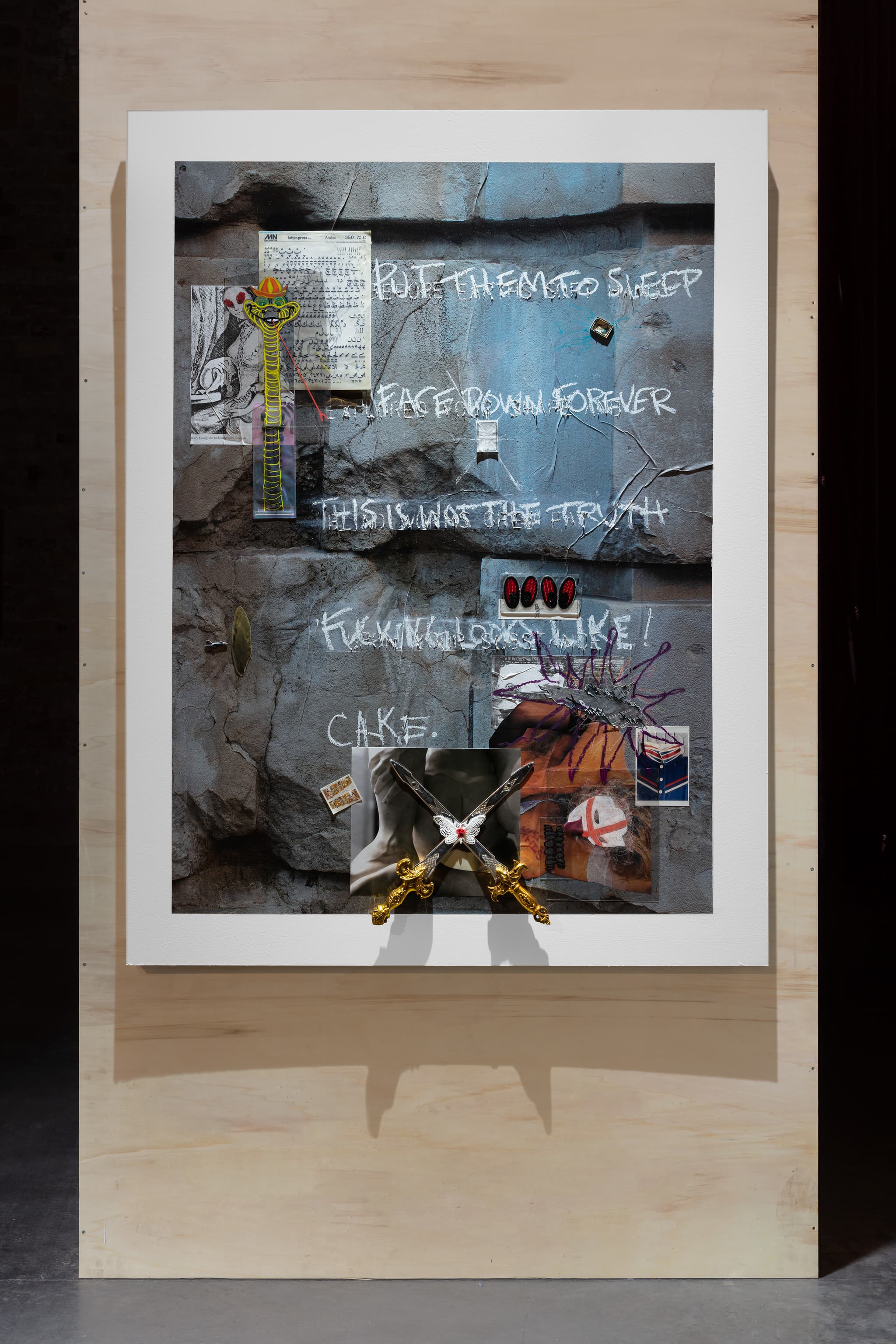 Acrylic, pastel, oil stick, iPhone case, stickers, plastic sword, c-type prints, acetate and found material on latex print on board, framed