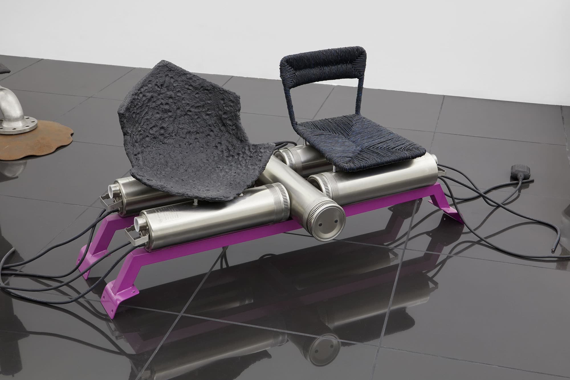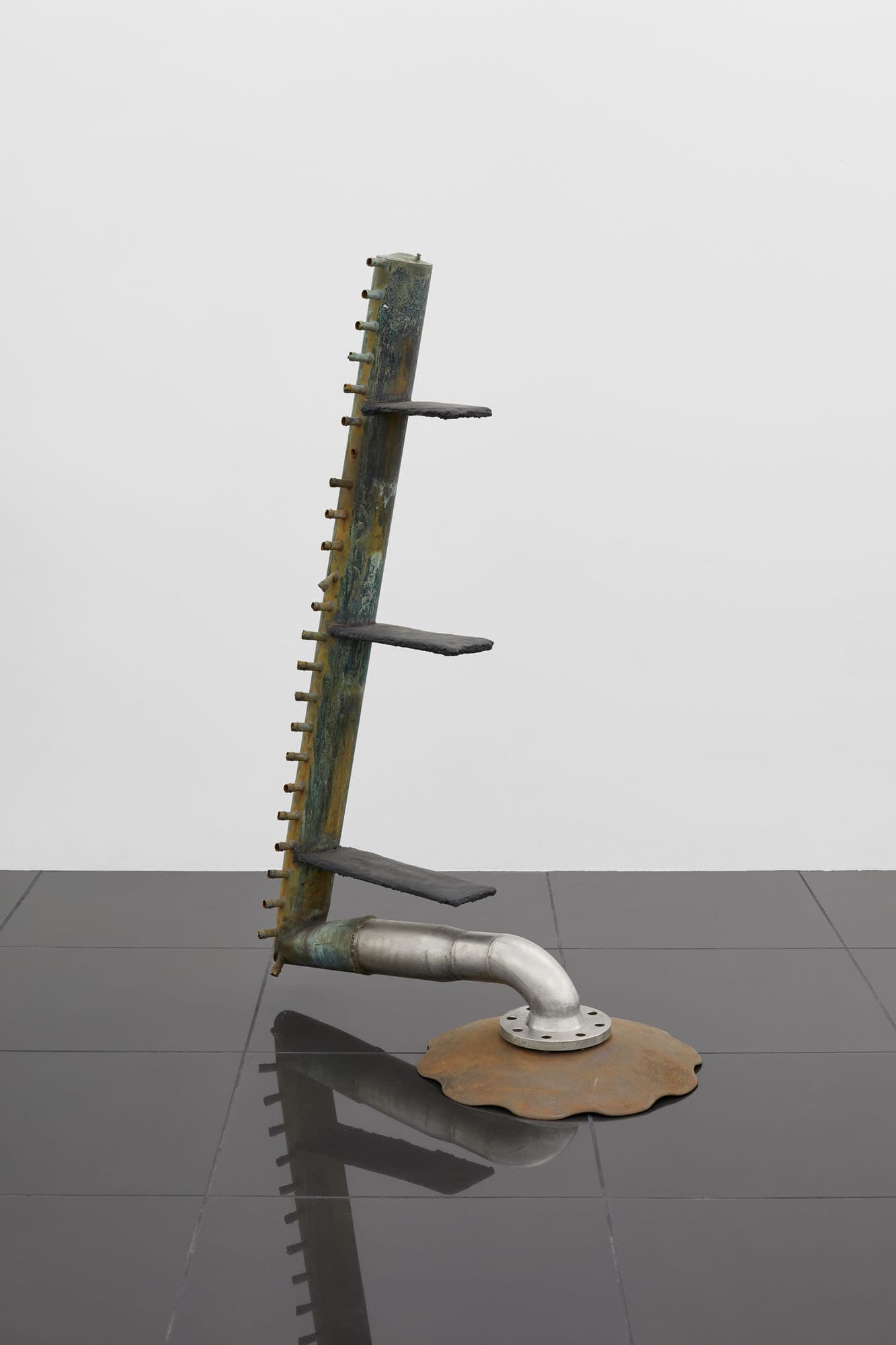 found copper pipe, stainless steel, found ploughing-tractor disc blade, concrete, pigment, paint