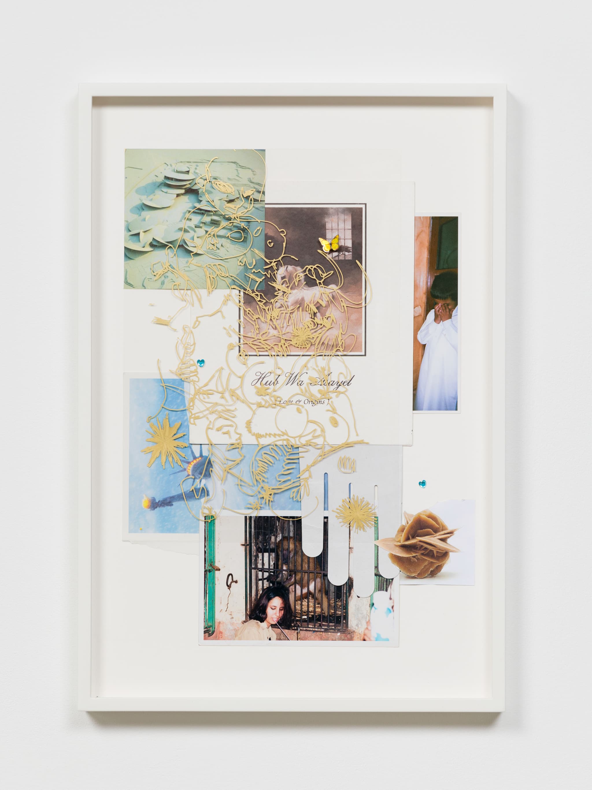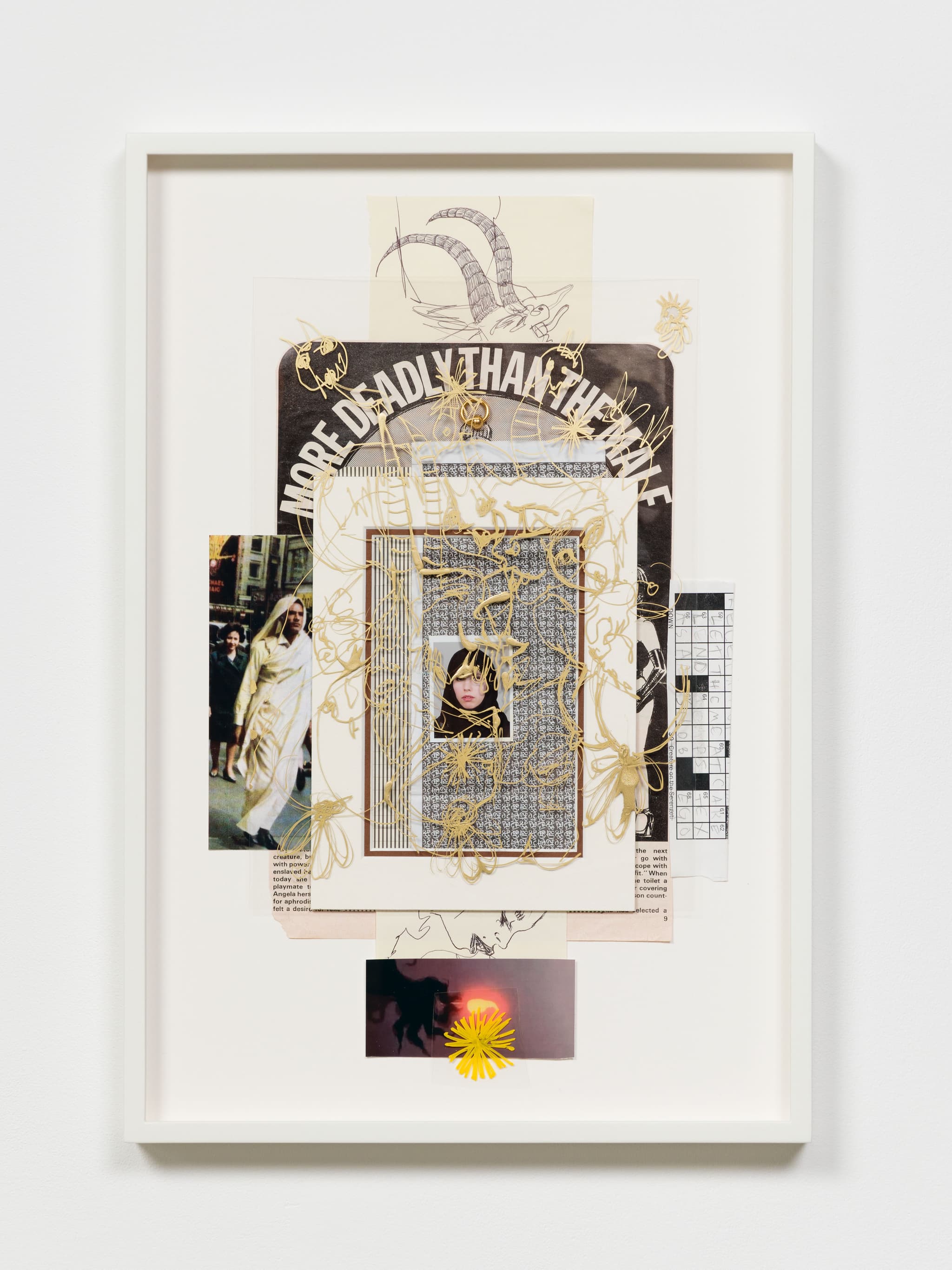 Photograph of Muammar Gaddafi in Piccadilly Circus, passport photo, pay slip, crossword puzzle, page from 1970s British Fetish Magazine, gold ring and pen on acetate, framed