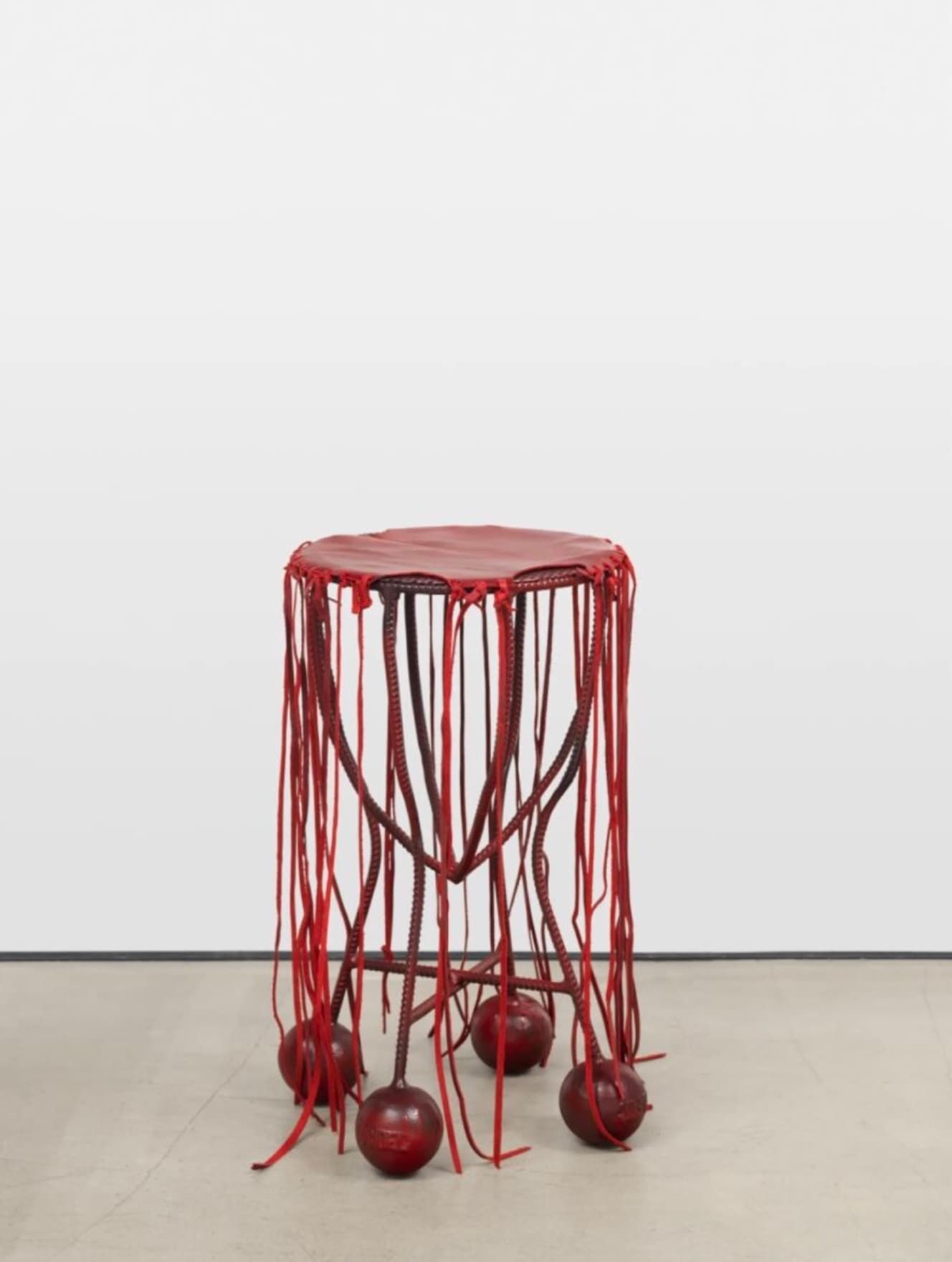 The room is defined as a publicly accessible community space, and its inaugural exhibition is Dozie Kanu’s Blood Type. Kanu practices intentionally at the intersecting points between design, fine art, performance, and set design — resulting in works such as a series of chairs including Chair [iii]; a chair made out of concrete and set atop a car wheel, or Student Loan Debt Relief; a more sculptural stool sprayed fittingly in money-green. In this case, he has filled the room with an installation that sets the tone for the accessible and free space going forward. If a visitor takes the elevator up, they step out directly into the room and onto a deep red wall-to-wall carpet. Greeting you as you step into the space is a metal ribbon that begins high on the wall in front of you and licks down to the floor where it turns into a table that curves through the space — a communal surface reminiscent of a more commercial space like a coffee bar, but painted crimson and punctuated by lock and key motifs. It begs the question of what public comfortable spaces exist like this, aside from people’s homes. Along the table there are a handful of stools to be used by visitors, also deep red, and recognizably Kanu’s by their found material assemblages of steel and leather. In front of the windows are not-quite-opaque curtains in the same color scheme that enclose the space.
