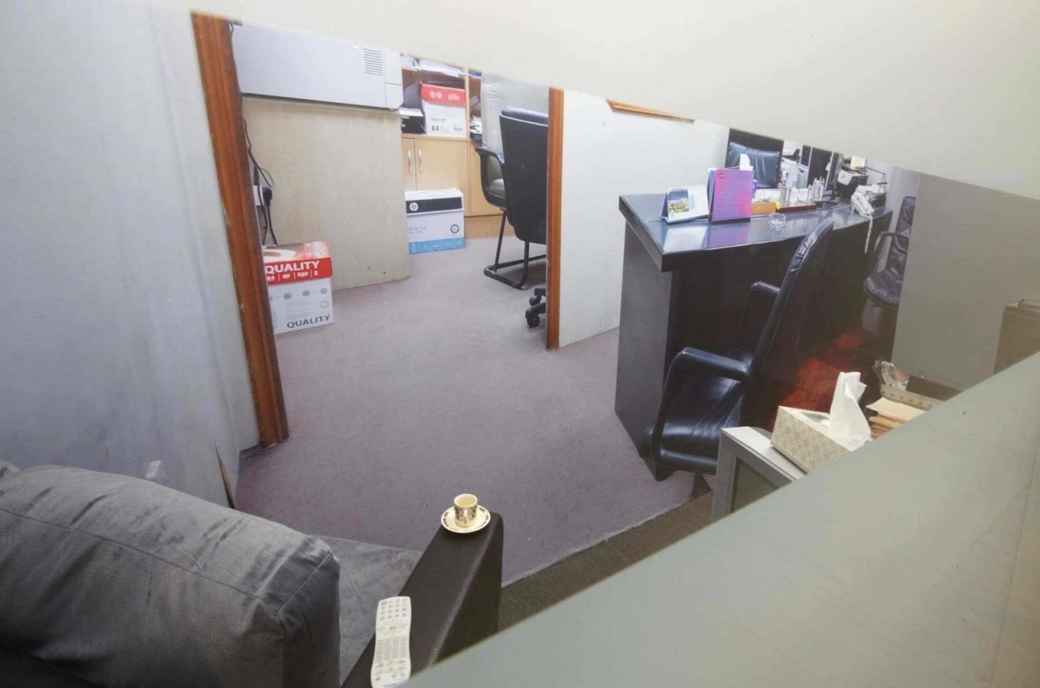 Despite their overall sleek aesthetic, many of the GCC's works contain hints of the facade's flimsiness. In actual stock photography, businessmen would not be wearing pajamas as a stand-in for traditional Arab dress. Nor would there be any evidence of a dingy back office, something that is, however, included in the show as an installation half-hidden behind a frosted glass screen. With its dull wall-to-wall carpeting and outdated electronics, the office is in stark contrast to the rest of the exhibition, revealing, perhaps, the gray tedium in which the rest of the show's opulent dreamscapes were produced.