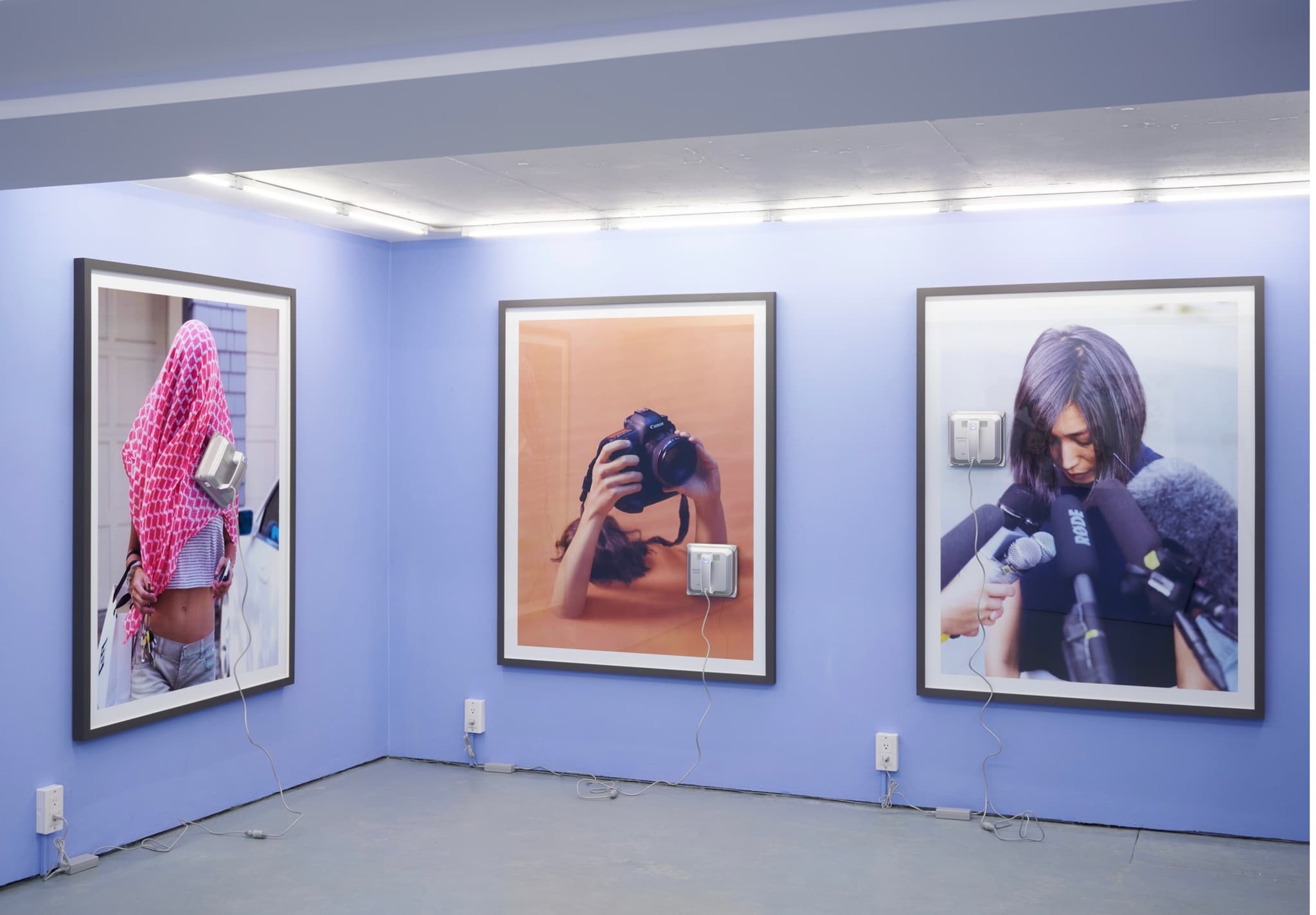 The walls of the gallery were painted Serenity, a shade of blue that, along with Rose Quartz, is one of the two Pantone colors of the year for 2016. The company stated in the New York Times that the pairing has to do with “societal movements toward gender equality and fluidity” as well as “an open exchange of digital information that has opened our eyes to different approaches to color usage.” On the gallery walls, Serenity appeared as a putrid shade of lilac that my five-year-old self would have selected for a princess dress. Three other large-format photographs were displayed framed under glass, on top of which very noisy Winbot window-cleaning machines ran: Serenity Now is a Photoshopped image of two arms holding a large-format Canon camera above a head that is signified by a mop of hair, whose owner disappears into light-brown mud; Becoming Genre is a restaged image of former Nickelodeon actress Amanda Bynes leaving her parents’ home with a scarf over her head, after she was reported to have said she wanted to kill them and burn down their house; and Apology is another restaged image, this time of Cho Hyun-ah, an executive at Korean Air and daughter of its chairman, making a public apology after being sentenced to one year in prison for delaying a plane because she was angry at how the nuts were served. The latter two works address moments in which the private selves and emotions of these individuals have leaked out into the public arena to be met with shame, prompting ritualistic enactments of guilt.