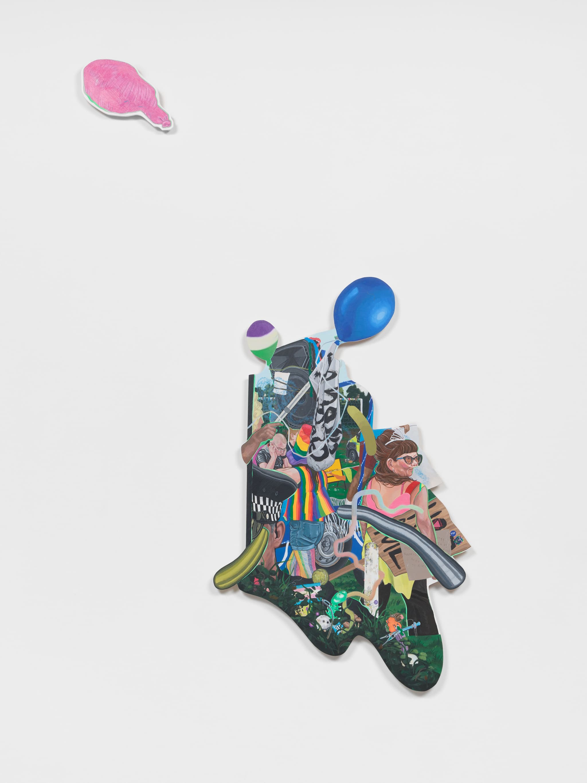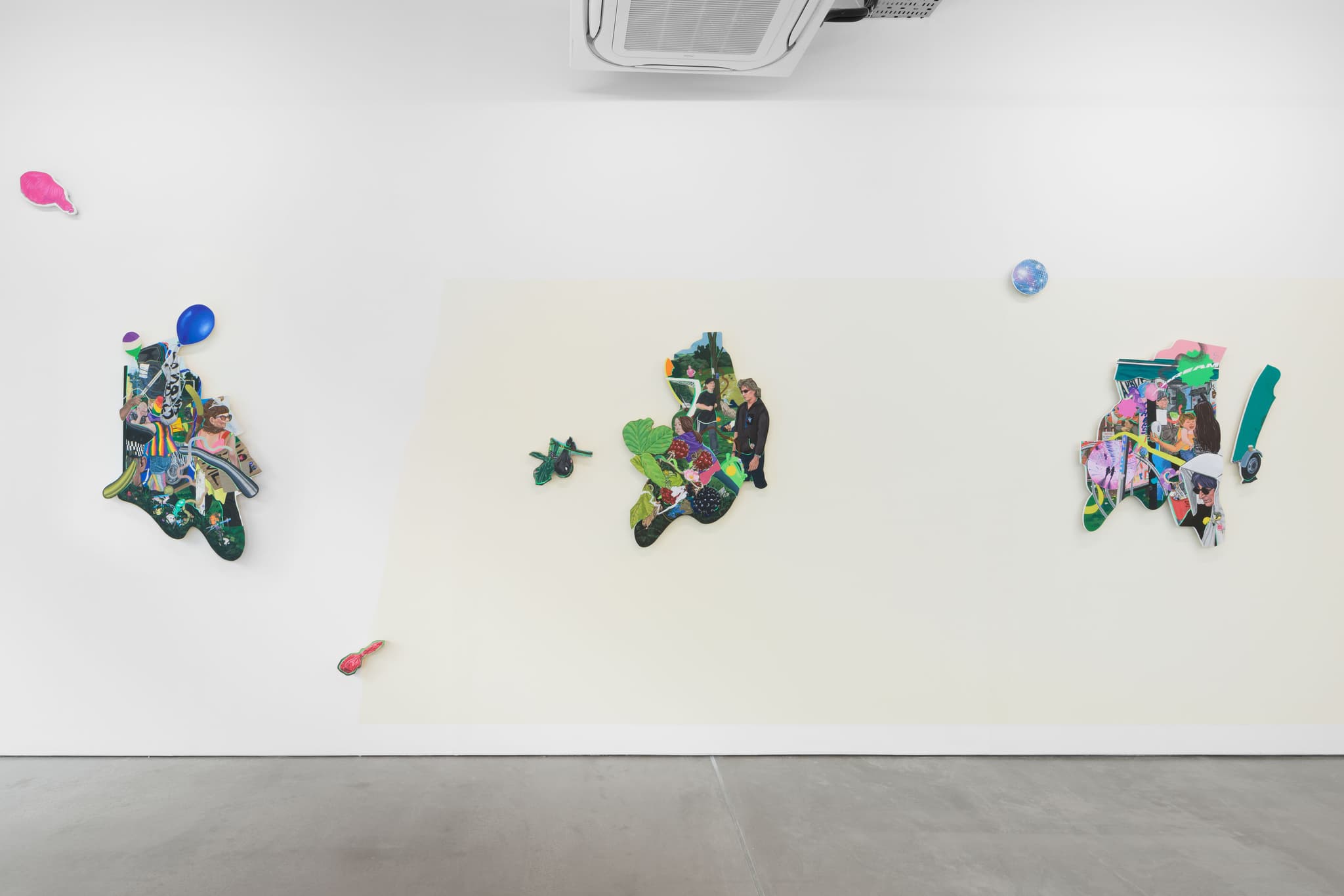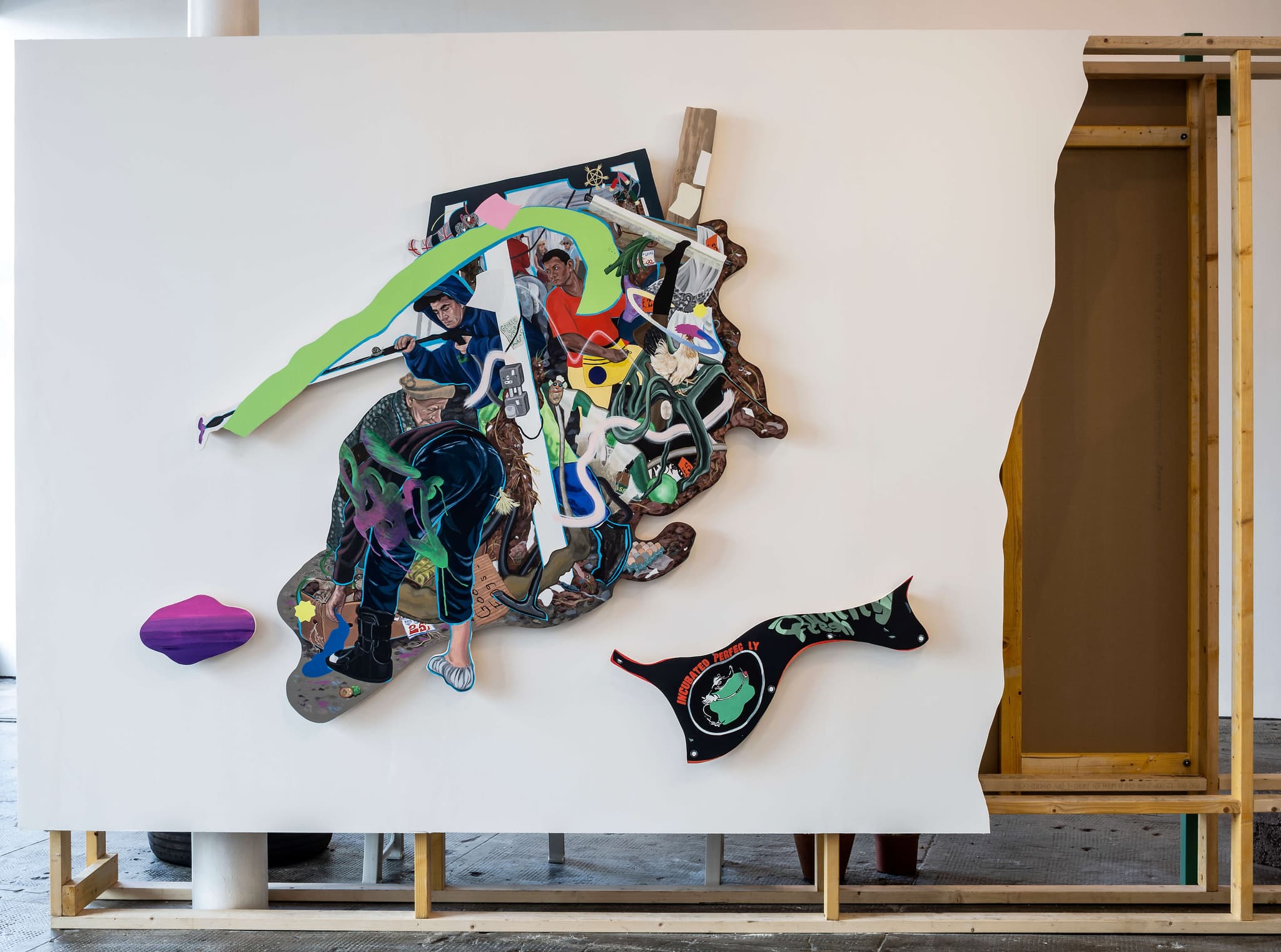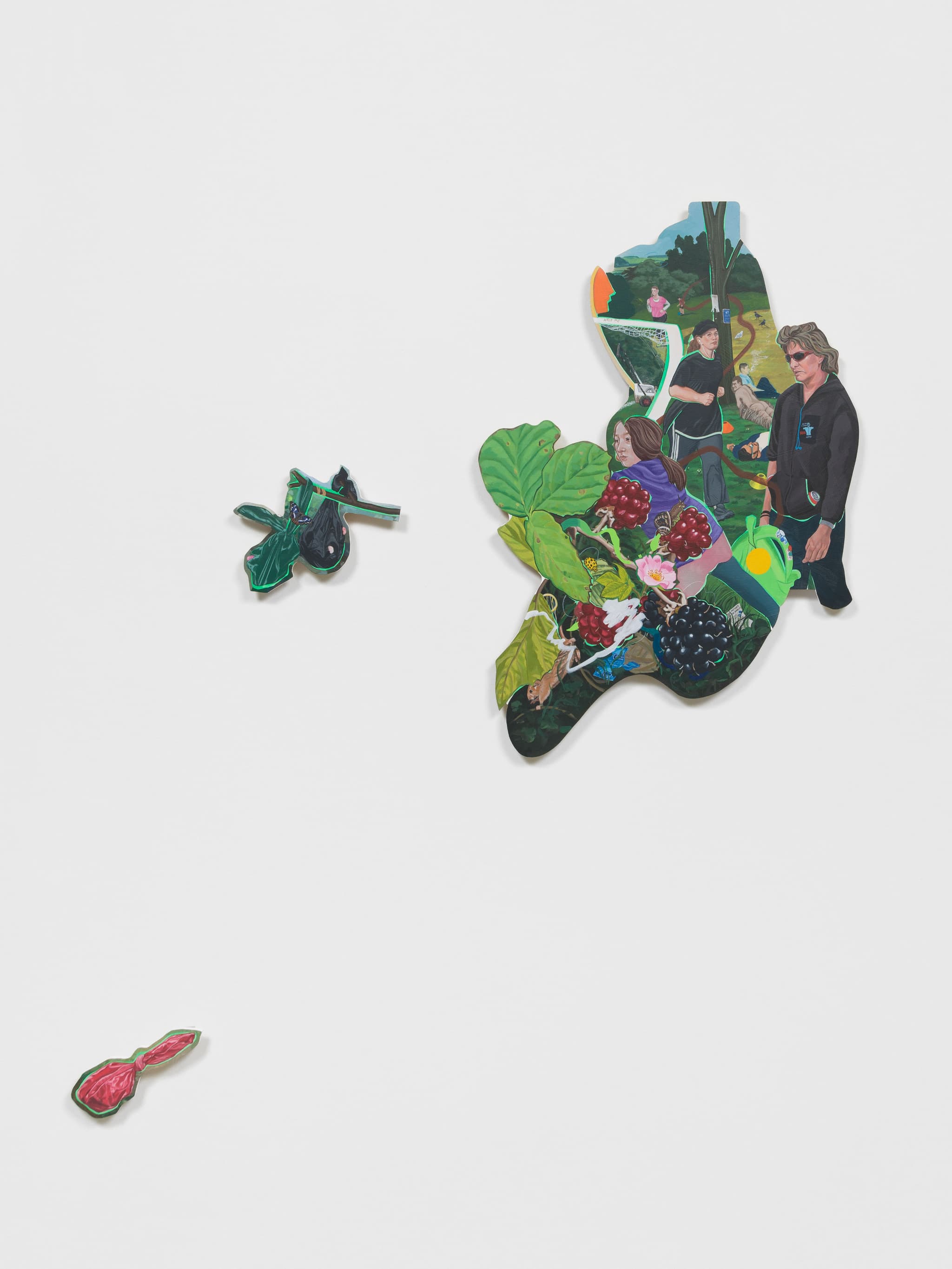 Acrylic on linen, appliqué on found material and hand-painted maple wood wall brackets