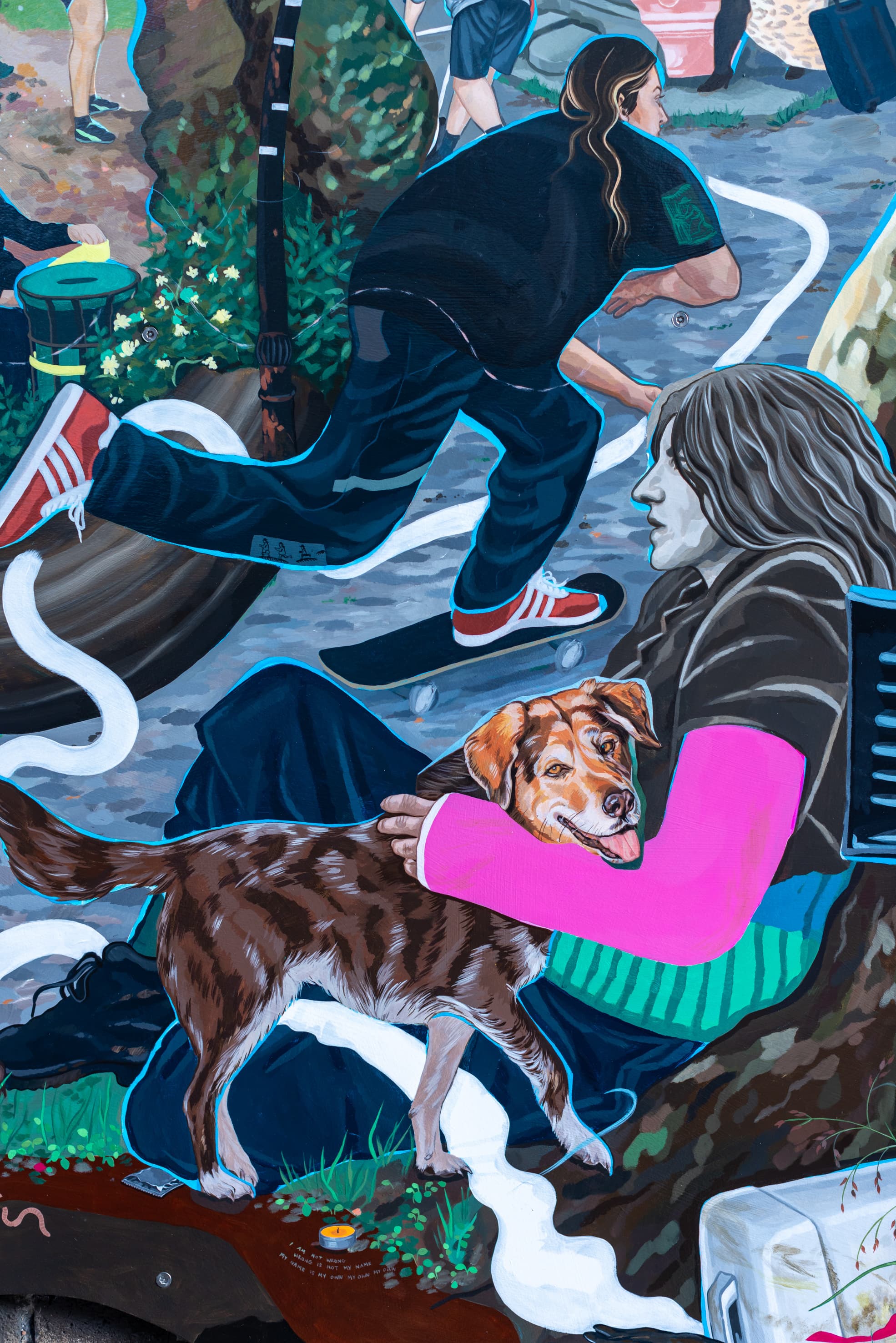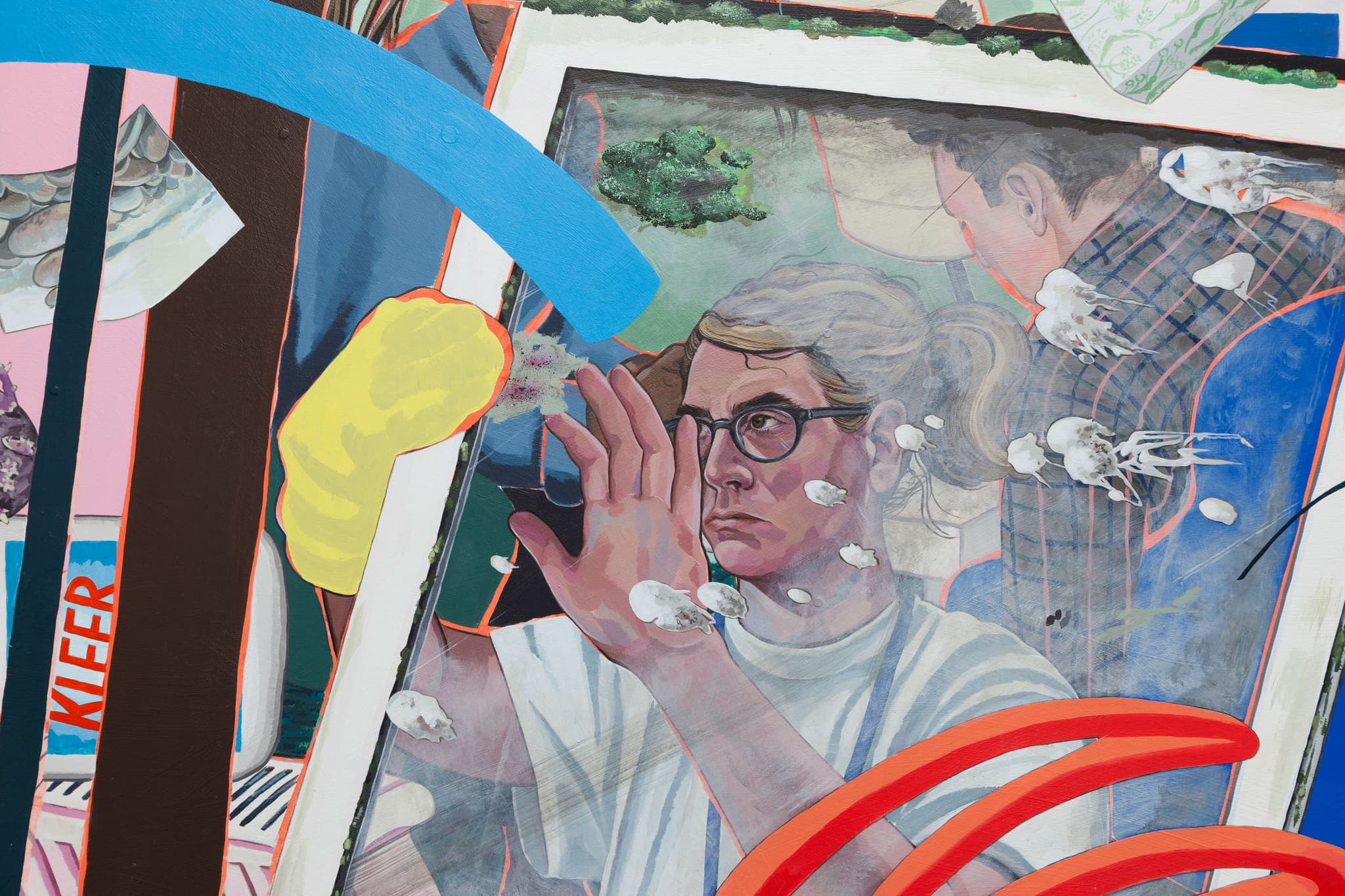 Acrylic on linen, appliqué on found material and metal