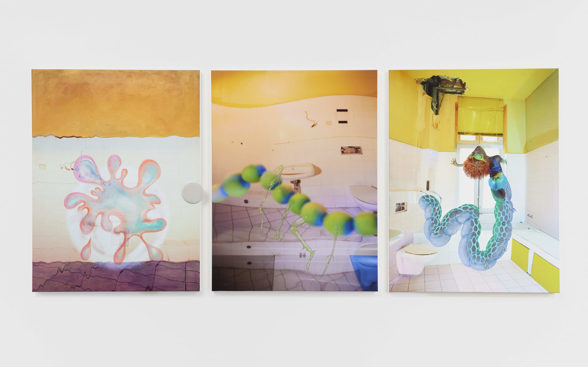 Triptych acrylic on printed canvas, vinyl stickers and plastic button
