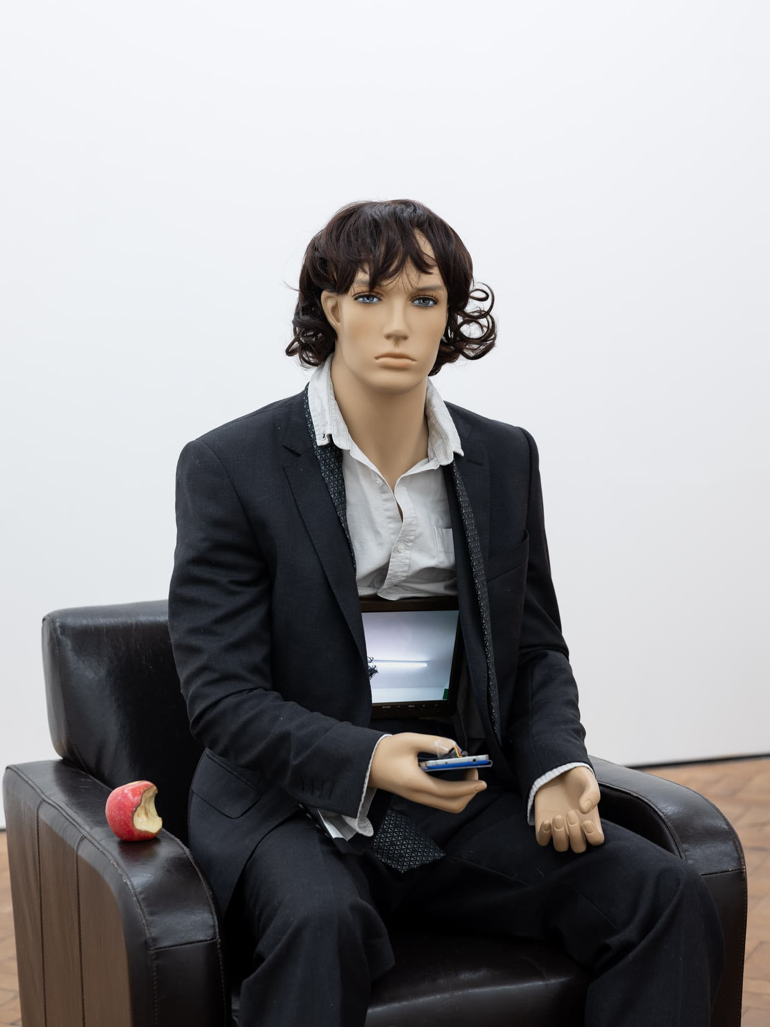Mannequin, microwave, table, cameras, screens, phone and apple