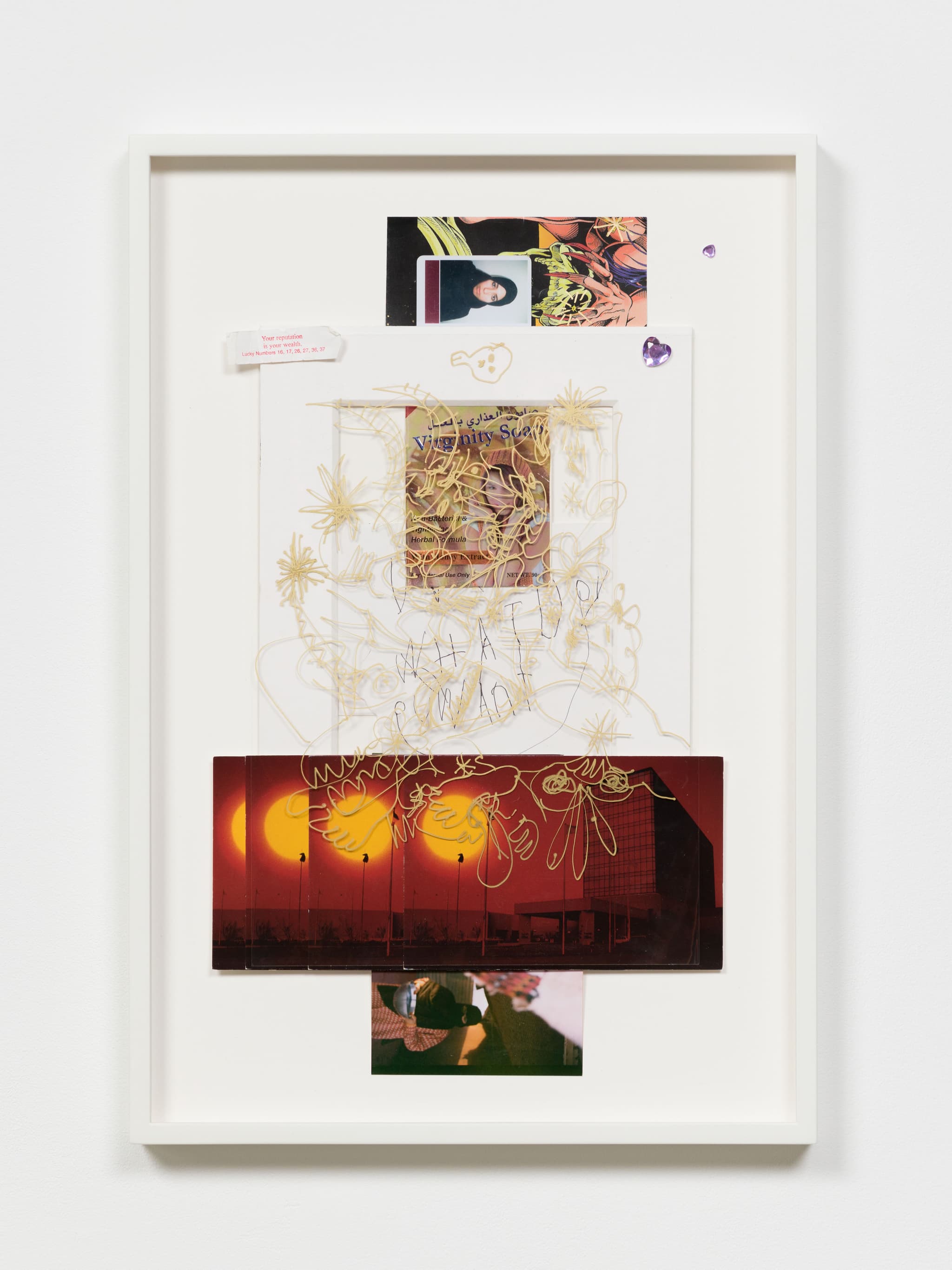 Identity card, cookie fortune, love heart gems, photographs, soap packaging, question by Aneesa, postcards from Doha Ramada, comic book scrap and pen on acetate, framed