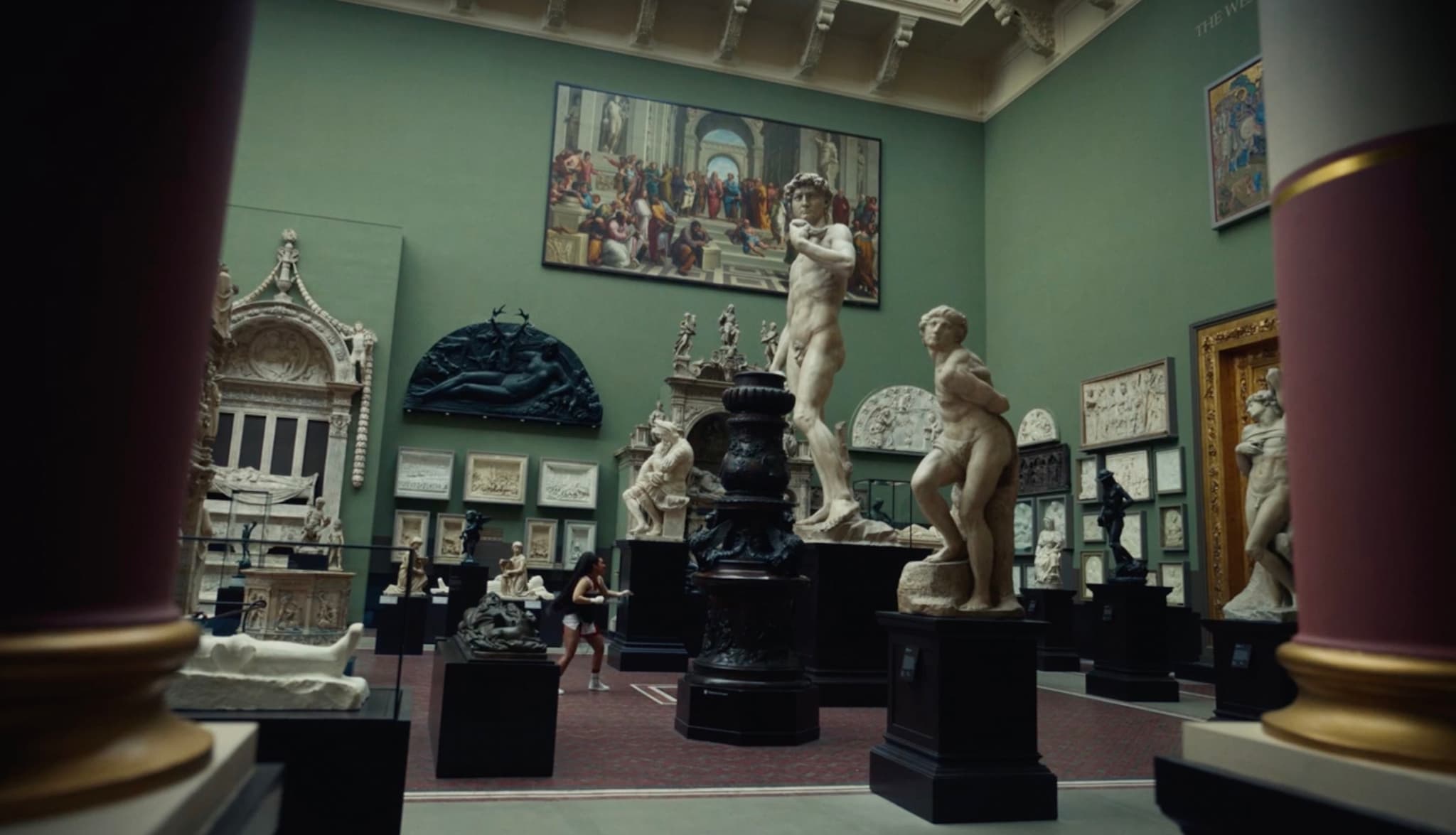 Al-Maria’s debut exhibition in the United States, at the Whitney Museum of Art, 2016, attends to the Gulf’s embrace of consumerism. Black Friday features primarily of shots of empty shopping centres in Doha. An unseen narrator declares the mall as the place “where the glamorous heart of evil is born”, a place of entrapment and confusion complete with faces blurred beyond recognition and bodies collapsed on the floor.
