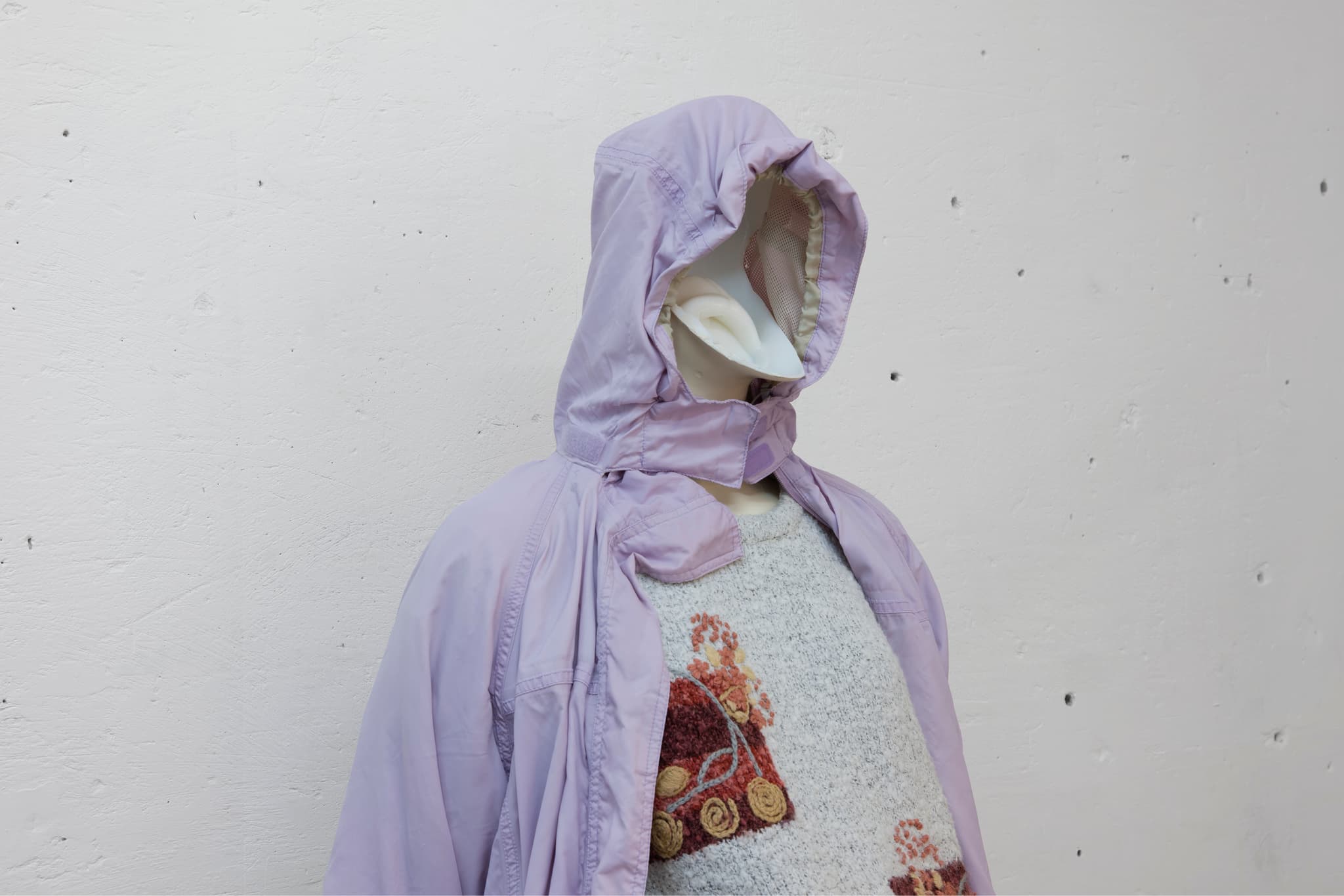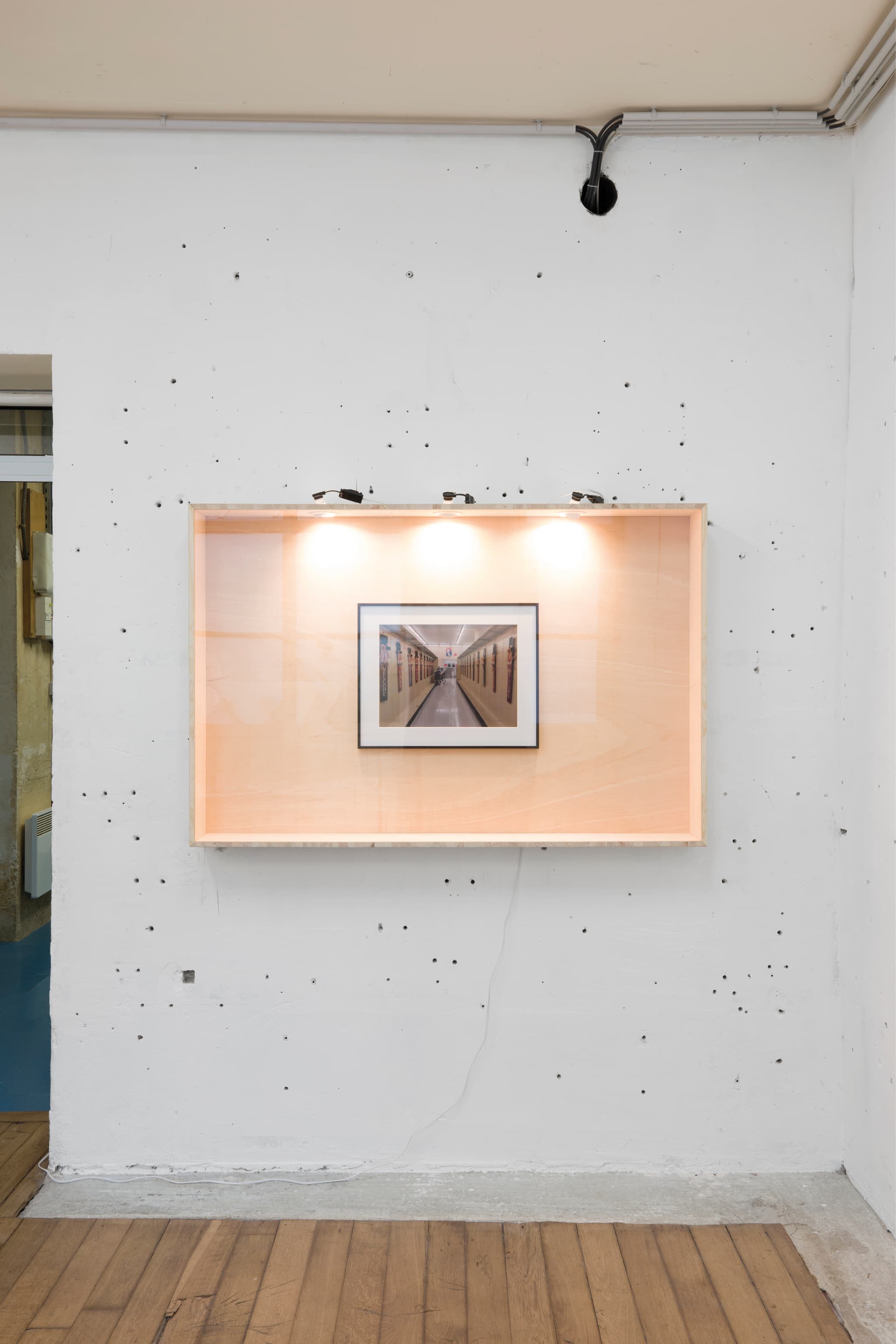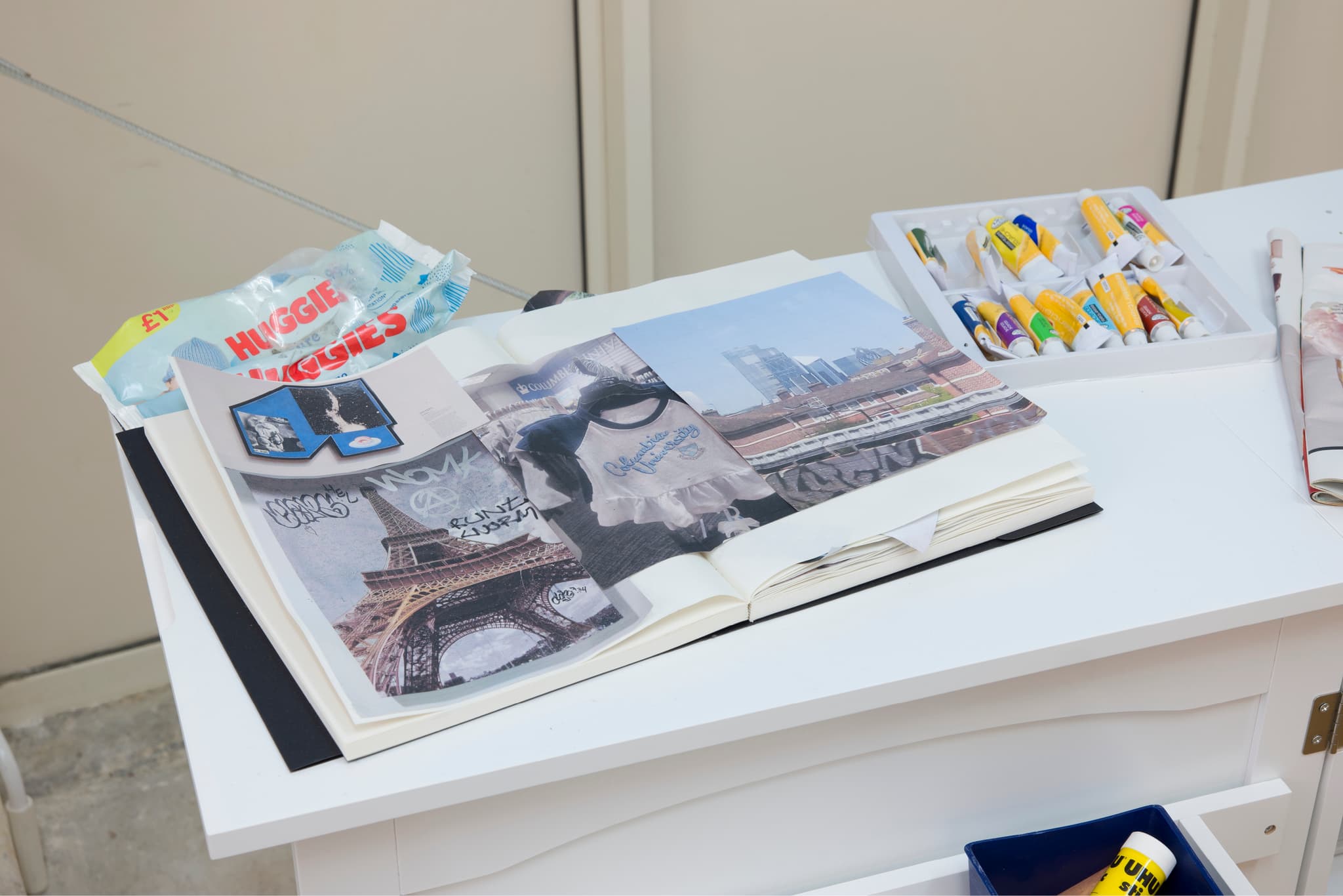 The booth has been re-made and represented now in 2024 with each element slightly changed. The mannequin is now pregnant and carrying homeware as opposed to a small flight case, the portfolio display is now a craft table. The original image in the frame was a view from the backseat of a car through the front seats and out the window.